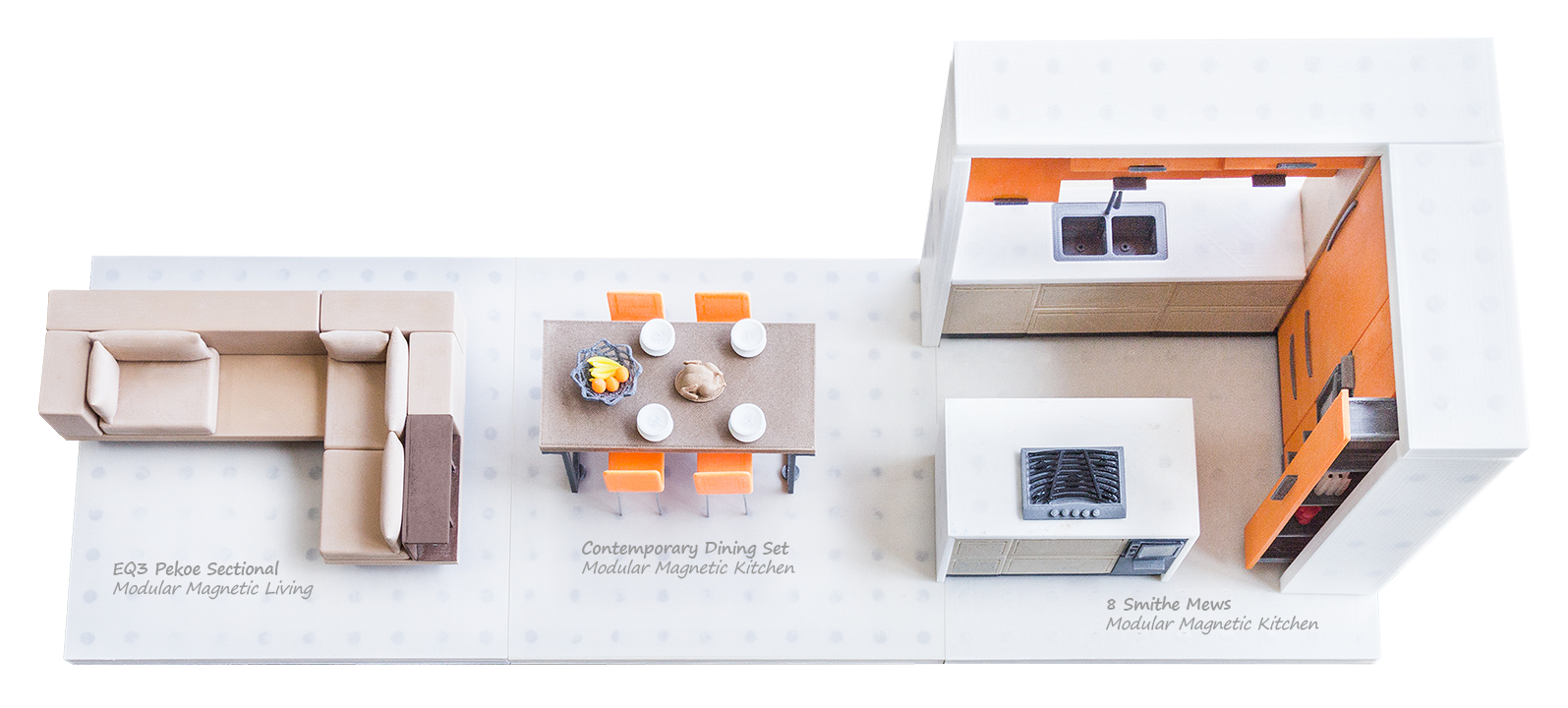 At the heart of each Modular Magnetic set are magnets. Magnets not only serve as the “glue” which holds your creations together, but they also guide you along the way, allowing you to place objects only where they would normally belong in the real kitchen.